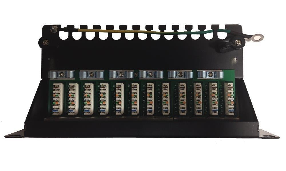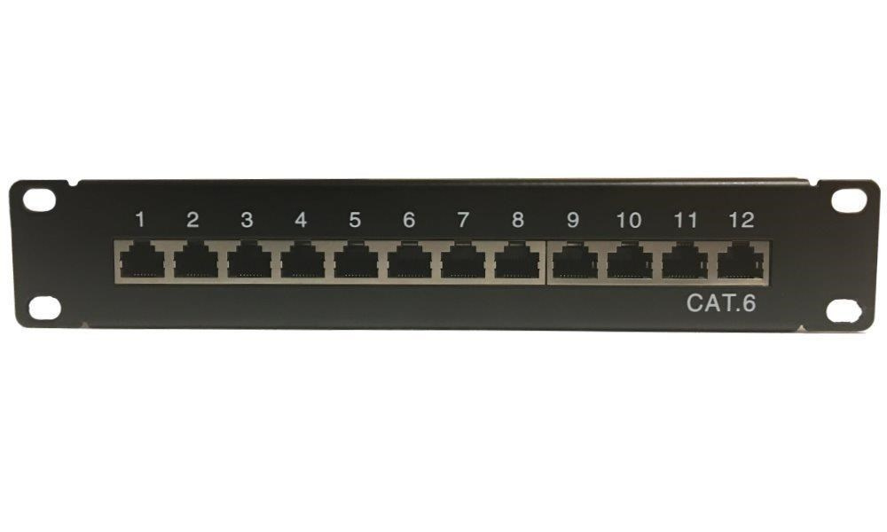 Patch panel vybavený 12 portami s Cat.6, vhodný pre nárazník typu LSA. Vnútorný kryt patch panelu umožňuje manipuláciu v malej skrinke bez rizika vytiahnutia kábla z rýchlokonektora. Svorky na správu káblov umožňujú pevne pritiahnuť káblový výstup k panelu. Súčasťou zariadenia je uzemnenie a pripojenie tienenia priamo k DPS.