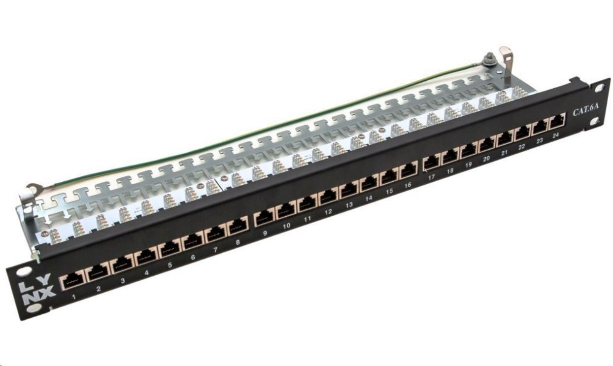 LYNX 19" patch panel 24-port, STP Cat6a, 50µ, stíněný, černý