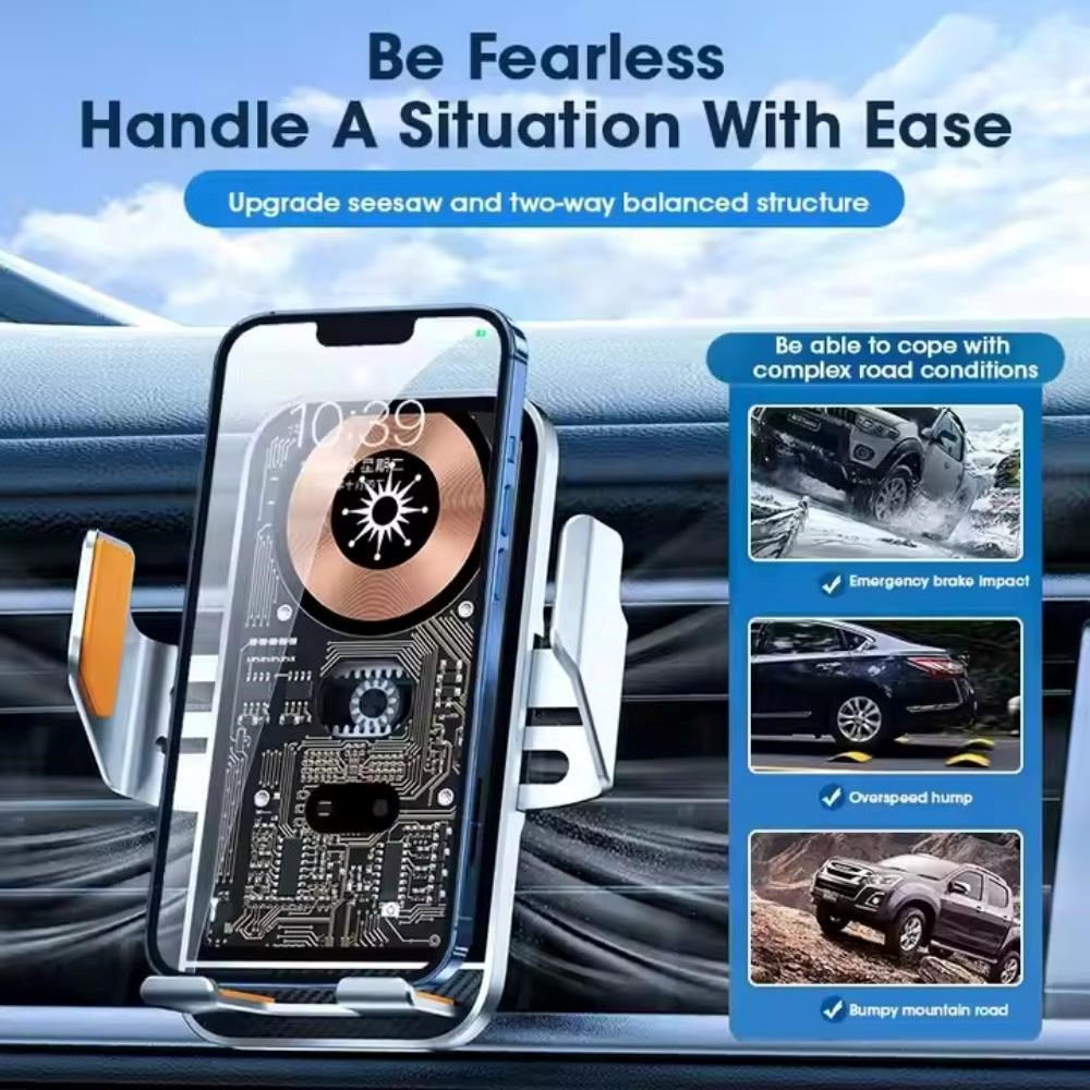 C10 Kvalitná hliníková bezdrôtová inteligentná nabíjačka do auta s optickým senzorom pre automatické roztiahnutie pri vkladaní telefónu a dotykovým senzorom pre otvorenie držiaka pri vybratí. Vybavená je držiakom s kĺbovou aretáciou na uchytenie do ventilácie.
