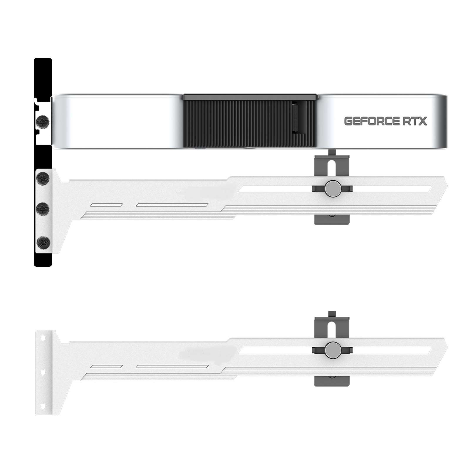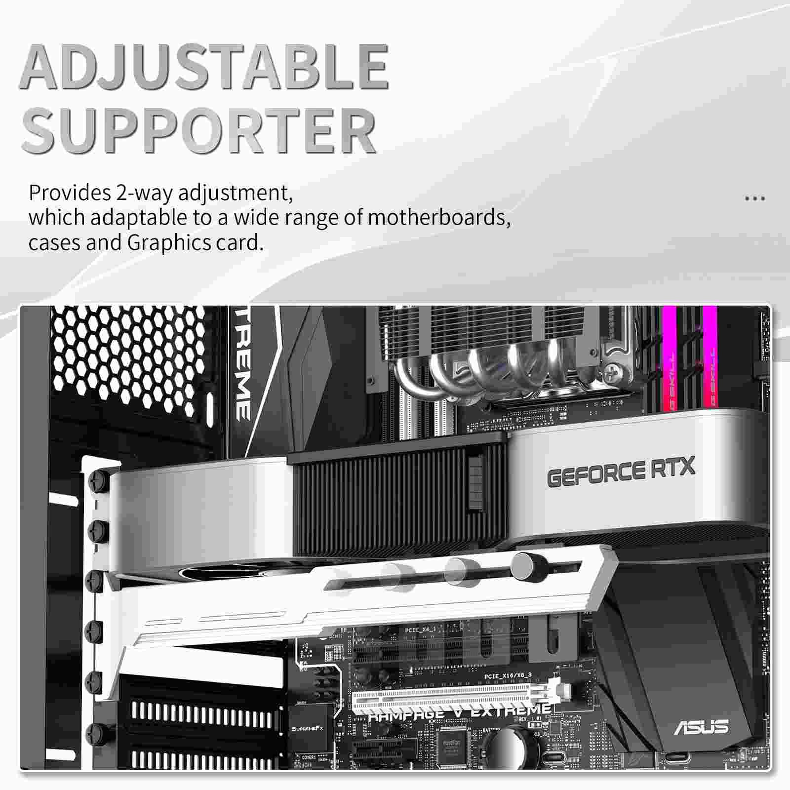 Štýlová verzia tejto opory vašej grafickej karty je vyrobená z oceľového práškového lakovaného plechu a plastu, zabraňuje prehýbaniu väčších kariet v zásuvke a dodáva tak zostave lepšiu celkovú stabilitu. Súčasťou je silikónová posuvná opora, ktorú možno posunúť horizontálne aj vertikálne a umožňuje inštaláciu na rôznych miestach karty, pre maximálnu kompatibilitu s väčšinou kariet. Rozmery držiaku sú 280 x 52 mm.