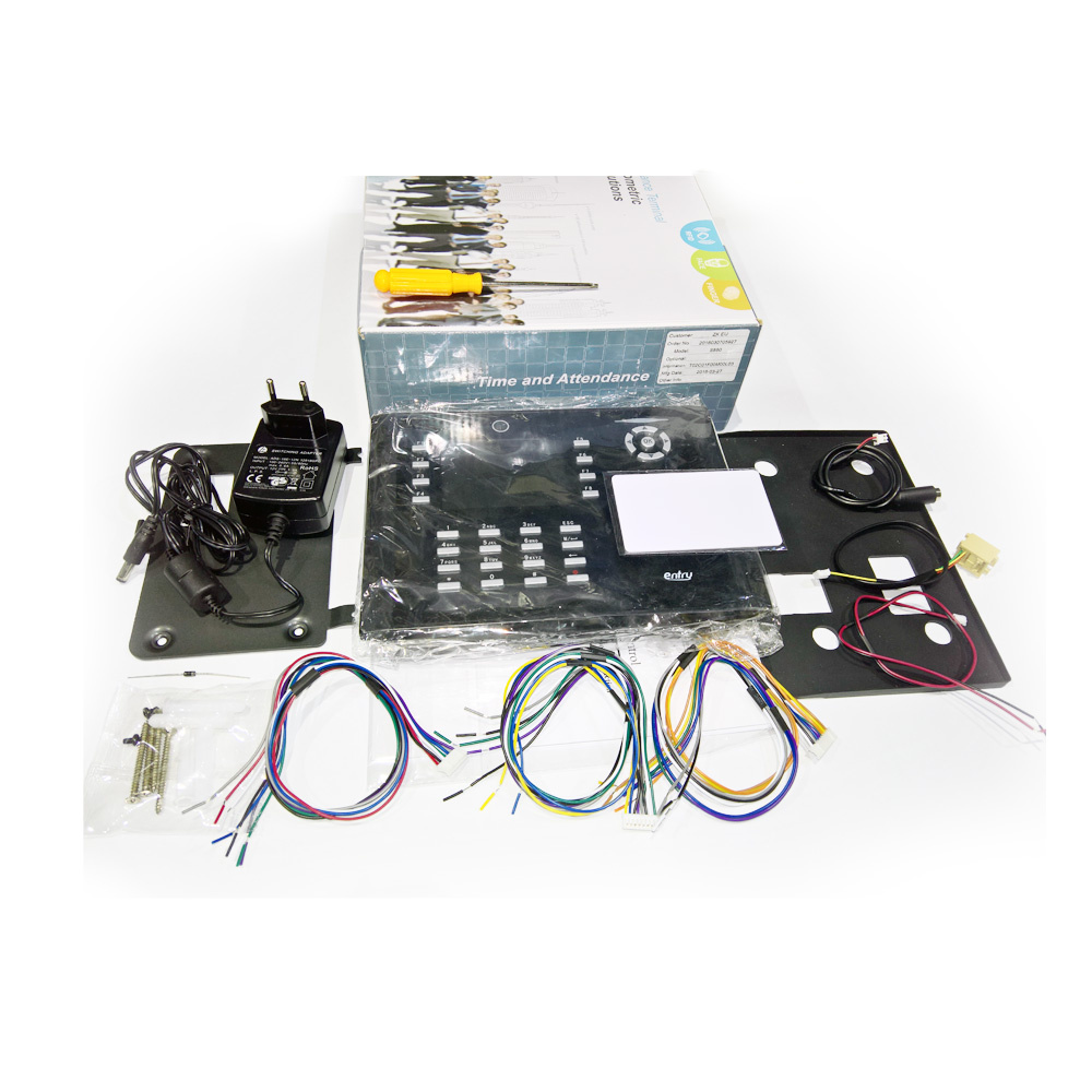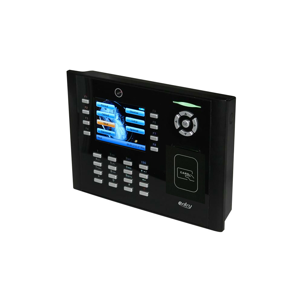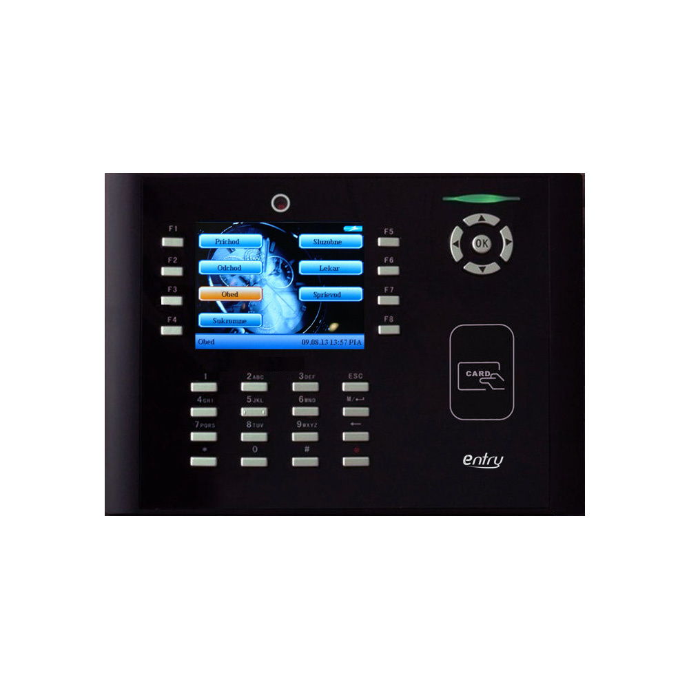 Dochádzkový terminál s duálnou RFID čítačkou (štandard EM4100, 125 kHZ, MIFARE 13,56 MHz, MIFARE DESFire EV1, MIFARE DESFire EV2) a kódovou klávesnicou, 10 000 kariet, 200 000 udalostí, 3,5" farebný grafický TFT displej, SK/CZ/EN jazyk, zvuková a LED signalizácia, plnohodnotné spracovanie dochádzky, 8 programovateľných tlačidiel prerušení, zabudovaná kamera pre zosnímanie zamestnanca, komunikácia s PC cez TCP/IP alebo RS-485 alebo RS-232. Funkcie prístupového terminálu: 1x NO/NC relé zámku, 1x NC vstupné relé dverného senzora, 1x NO výstupné relé alarmu, 1x NO vstupné relé odchodového tlačidla, 1x kontakt pre privolanie obsluhy, 1x Wiegand 26(34) bit vstup pre pripojenie externej RFID čítačky, 1x Wiegand 26(34) bit výstup pre pripojenie dochádzkového terminálu do Entry prístupového kontroléra, USB port pre prenos údajov a zmenu obrázka pozadia displeja, napájanie 12 V DC / 400 mA (zdroj je súčasťou). USB port pre prenos údajov a zmenu obrázka pozadia displeja, rozmery 225 x 165 x 50 mm, interiérové použitie. Možnosť pripojenia k terminálu cez webové prostredie pre jednoduchú HW konfiguráciu zariadenia.
