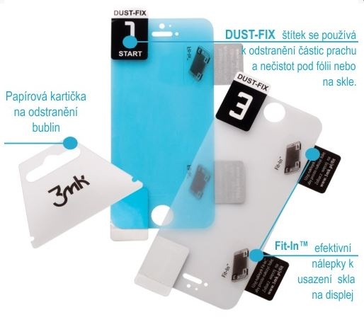 - Použité technológie - 2,5D zaoblené hrany, oleofóbný náter, lepidlo Inviscid-Sil™, vrstva fólie Anti-Crash, polohovacie pásky Fit-In™, pásky Dust-Fix™
