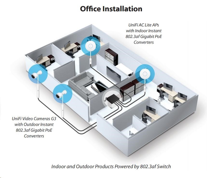 tento gigabitový konvertor možno použiť na napájanie prepínačov UBNT s aktívnym PoE podľa normy 802.3af (48 V). Prevodník komunikuje so spínačom podľa 802.3af a výstup je už klasický pasívny PoE, v tomto prípade 24V/0,5A. Môže sa používať so všetkými jednotkami Ubiquity (je kompatibilný aj s routerboardmi Mikrotik).