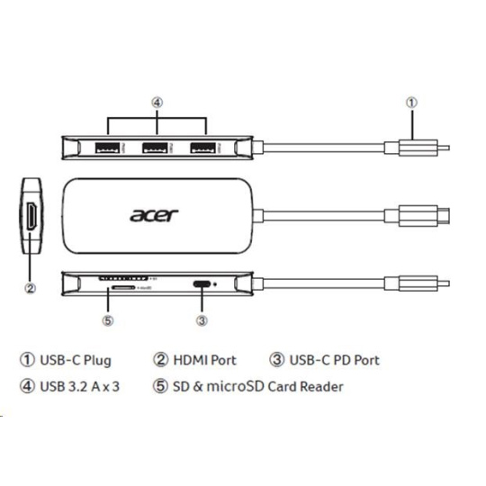 ACER Dokovací stanice 7in1 Type-C dongle, 1x HDMI, 3x USB-A 3.2 Gen1, 1x SD 3.0, 1x microSD, 1x USB-C, silver