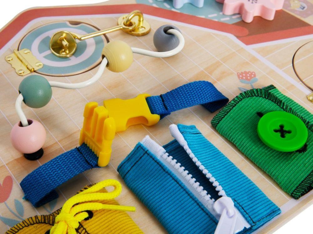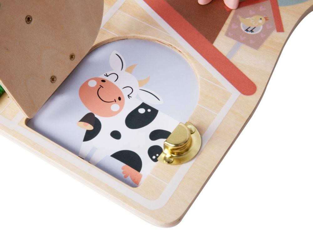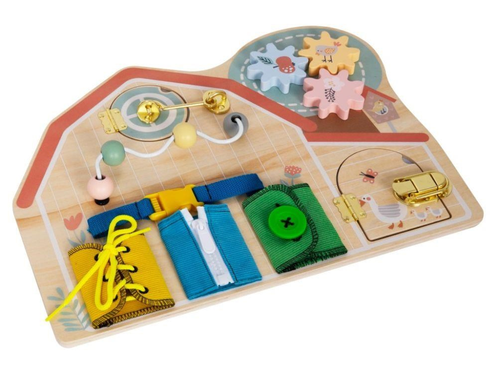 Aktivity board v podobe farmy zaviedne dievčatá aj chlapcov na vidiek, kde si pohrajú s hracími prvkami a osvojí si pár praktických zručností. Activity board s ozubenými kolami, korálkovým bludišťom, dvierkami a okienkom, rôznymi zámkami a rôznymi spôsobmi zapínania vedie deti k samostatnosti v hre, v poznávaní a učení sa, v obliekaní.