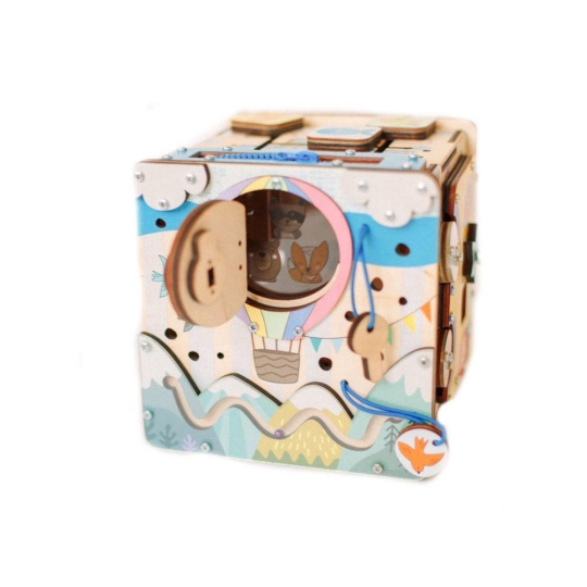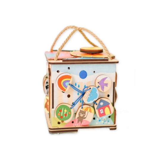 Activity board kostka so zábavnými a montessori prvkami nadchne dievčatá aj chlapcov. Jednoducho prenášateľná kostka si pre deti pripravila logické aj zábavné hry, ktoré deti zabavia a zdokonalia ich zručnosti. Každá strana activity board kostky je originálna a prináša iné dobrodružstvá. Na vrchnú strane kostky nájdete veľký slniečkový vypínač, s jeho pomocou kostku rozsvietite. Activity kostka na cesty je montessori hračkou aj nočným svetielkom (promítačkou).