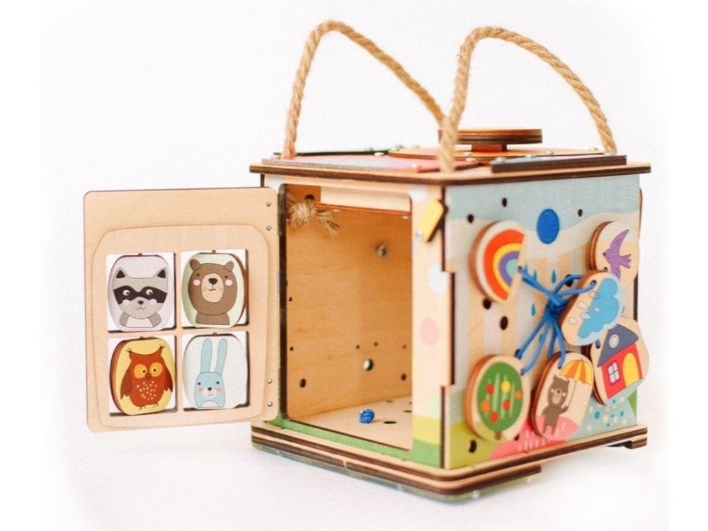 Activity board kostka so zábavnými a montessori prvkami nadchne dievčatá aj chlapcov. Jednoducho prenášateľná kostka si pre deti pripravila logické aj zábavné hry, ktoré deti zabavia a zdokonalia ich zručnosti. Každá strana activity board kostky je originálna a prináša iné dobrodružstvá. Na vrchnú strane kostky nájdete veľký slniečkový vypínač, s jeho pomocou kostku rozsvietite. Activity kostka na cesty je montessori hračkou aj nočným svetielkom (promítačkou).