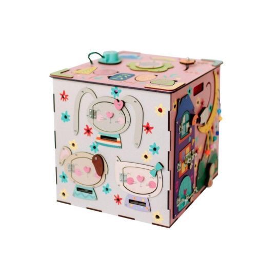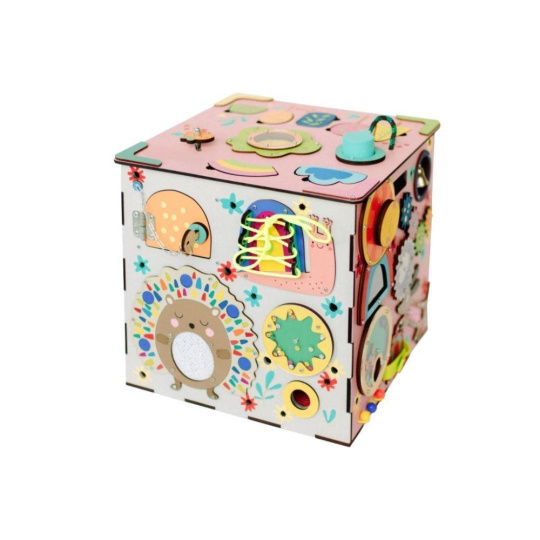 Activity board kostka s LED osvetlením XXL je originálna montessori hračka, ktorá deti zabaví, zdokonalí ich schopnosti a naučí ich novým zručnostiam. Každá strana ružového activity boardu je originálna a ponúka nespočet možností na hru, skúmanie a objavovanie. Nechýbajú ozubené kolieska a kolečka, rôzne spôsoby zapínania, šnúrka, rôzne spôsoby zatvárania, koráliky, bludisko, vkladačky puzzle, rôzne prekvapenia i slnečný vypínač, ktorý activity board kostku rozzáari.