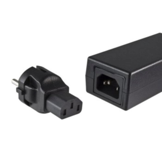 Napájací adaptér v čiernom prevedení, so vstupným konektorom CEE 7/7 a výstupným IEC C13. Výstupná zásuvka je rovná, nemeckého typu, s ochrannými plieškami po stranách, vhodná na pripojenie vidlice, ktorá je vybavená zemniacimi plieškami po stranách.