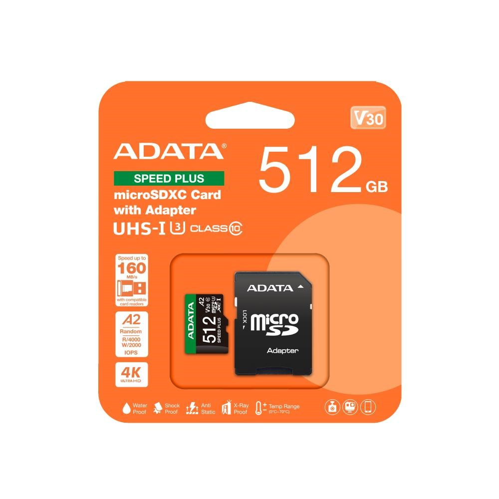 ADATA MicroSDXC karta 512GB Speed Plus, U3, C10, A2, V30 (R:180/W:160 MB/s) + SD adaptér