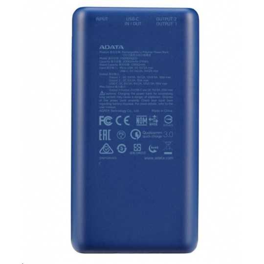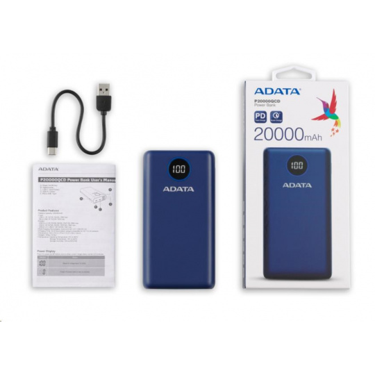 ADATA PowerBank P20000QCD - externá batéria pre mobilný telefón/tablet 20000mAh, 2,1A, modrá (74Wh)