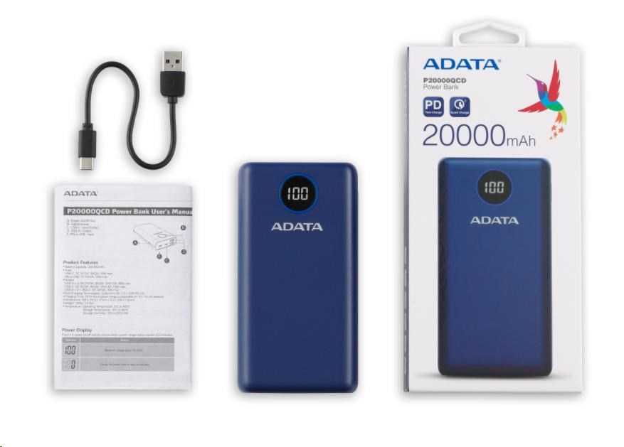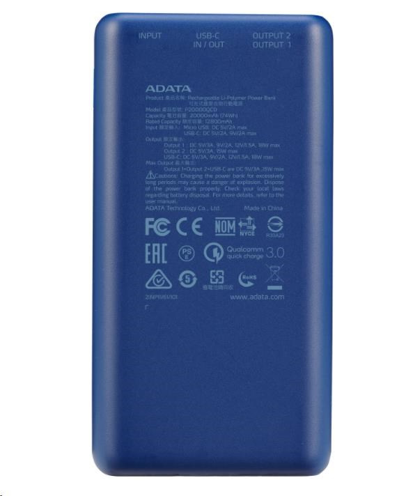 ADATA PowerBank P20000QCD - externá batéria pre mobilný telefón/tablet 20000mAh, 2,1A, modrá (74Wh)