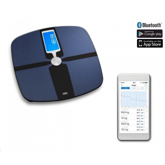 Diagnostická osobná váha ADE BA 1600 FITvigo s bluetooth má nosnosť do 180 kg s rozlíšením 100 g. Povrch je sklenený so špeciálnou úpravou, váha má osvetlený inverzný displej a pamäť pre 8 používateľov. Možný je prenos nameraných dát do mobilného zariadenia cez bluetooth. Zobrazenie a uloženie nameraných dát pomocou aplikácie FITvigo v mobilnom zariadení, alebo na serveri ADE.