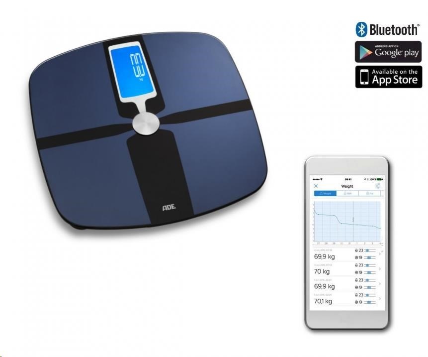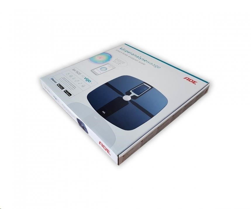 Diagnostická osobná váha ADE BA 1600 FITvigo s bluetooth má nosnosť do 180 kg s rozlíšením 100 g. Povrch je sklenený so špeciálnou úpravou, váha má osvetlený inverzný displej a pamäť pre 8 používateľov. Možný je prenos nameraných dát do mobilného zariadenia cez bluetooth. Zobrazenie a uloženie nameraných dát pomocou aplikácie FITvigo v mobilnom zariadení, alebo na serveri ADE.