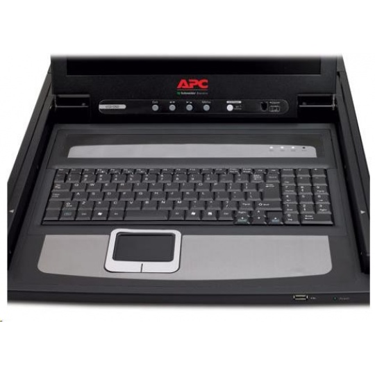 Konzola s klávesnicou, myšou a LCD displejom s rozložením klávesnice pre americkú angličtinu.