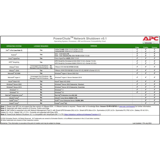 Licencia na sieťové vypnutie PowerChute na 6 rokov. Licenčné obdobie začína aktiváciou licencie koncovým používateľom. Jednoduchá integrácia so všetkými dodávateľmi virtualizácií a HCI. V prípade výpadku napájania umožňuje APC UPS plynulé vypnutie sústavy zariadení.