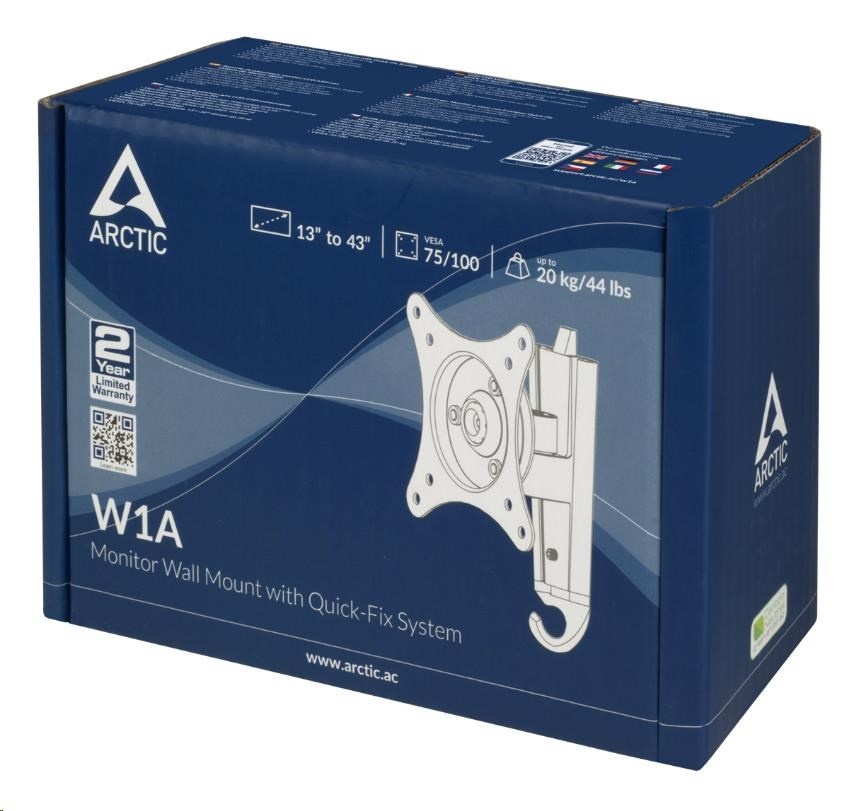ARCTIC W1A je jednootáčkový držiak s 3-osovým kĺbom, ktorý ponúka plynulé nastavenie uhla obrazovky s 360° rotáciou, 60° otočením a ±15° náklonom. Konštrukcia s guľovým kĺbom poskytuje flexibilitu na dokonalé umiestnenie monitora, aby sa znížilo namáhanie očí, krku, ramien a chrbta. Pripevňuje sa tesne k stene a maximalizuje pracovnú plochu. Dvojdielny systém priamej montáže, ktorý je kompatibilný s monitormi s uhlopriečkou od 13" do 43", umožňuje rýchlu inštaláciu a podporuje hmotnosť až do 20 kg.