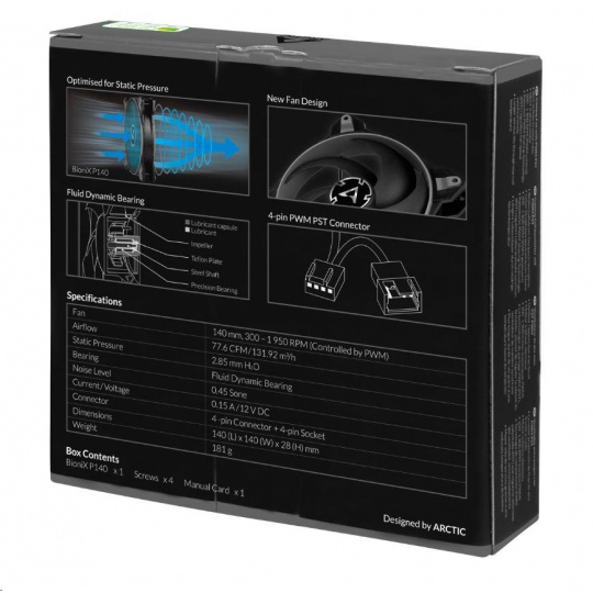 Ventilátor zaručuje mimoriadne účinné chladenie aj pri zvýšenom odpore vzduchu. Preto je BioniX P140 obzvlášť vhodný na použitie na chladičoch a radiátoroch. - ÚČINNEJŠIA TECHNOLÓGIA - Motor je poháňaný neodymovo-železno-boronovým magnetickým krúžkom najnovšej generácie, vďaka ktorému nový BioniX P140 pracuje oveľa efektívnejšie ako jeho predchodcovia. Tým sa šetrí energia a znižuje teplota cievky bez toho, aby sa znížil jej výkon.