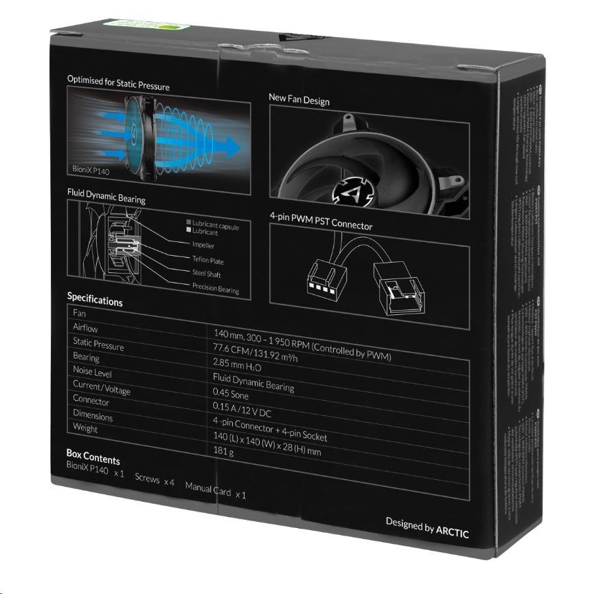 Ventilátor zaručuje mimoriadne účinné chladenie aj pri zvýšenom odpore vzduchu. Preto je BioniX P140 obzvlášť vhodný na použitie na chladičoch a radiátoroch. - ÚČINNEJŠIA TECHNOLÓGIA - Motor je poháňaný neodymovo-železno-boronovým magnetickým krúžkom najnovšej generácie, vďaka ktorému nový BioniX P140 pracuje oveľa efektívnejšie ako jeho predchodcovia. Tým sa šetrí energia a znižuje teplota cievky bez toho, aby sa znížil jej výkon.