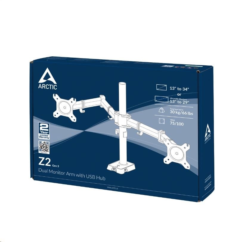 Stolný držiak ARCTIC Z2 (Gen3) pre 2x LCD do 34", nosnosť 2x15 kg, 4x USB HUB, čierny