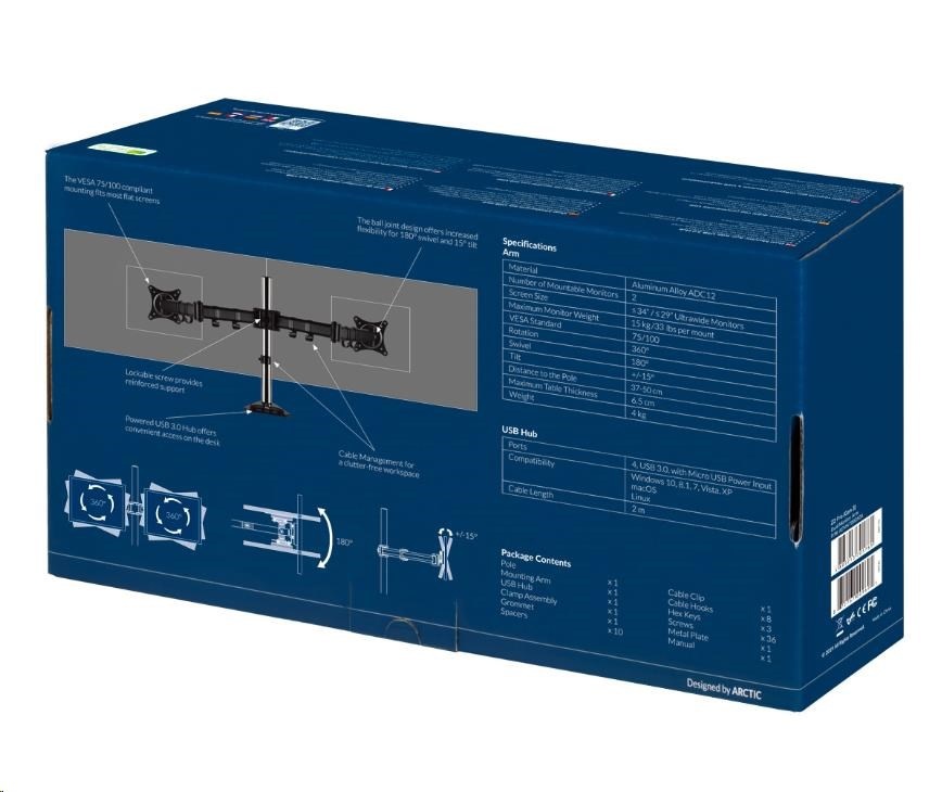 Stolný držiak ARCTIC Z2 Pro (Gen3) pre 2x LCD do 34", nosnosť 2x15 kg, 4x USB HUB, čierny