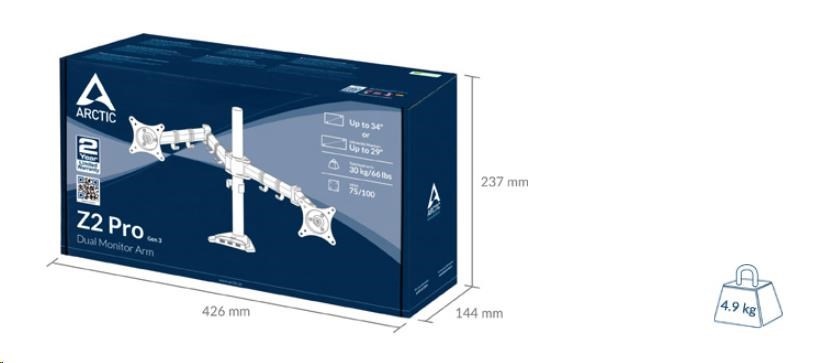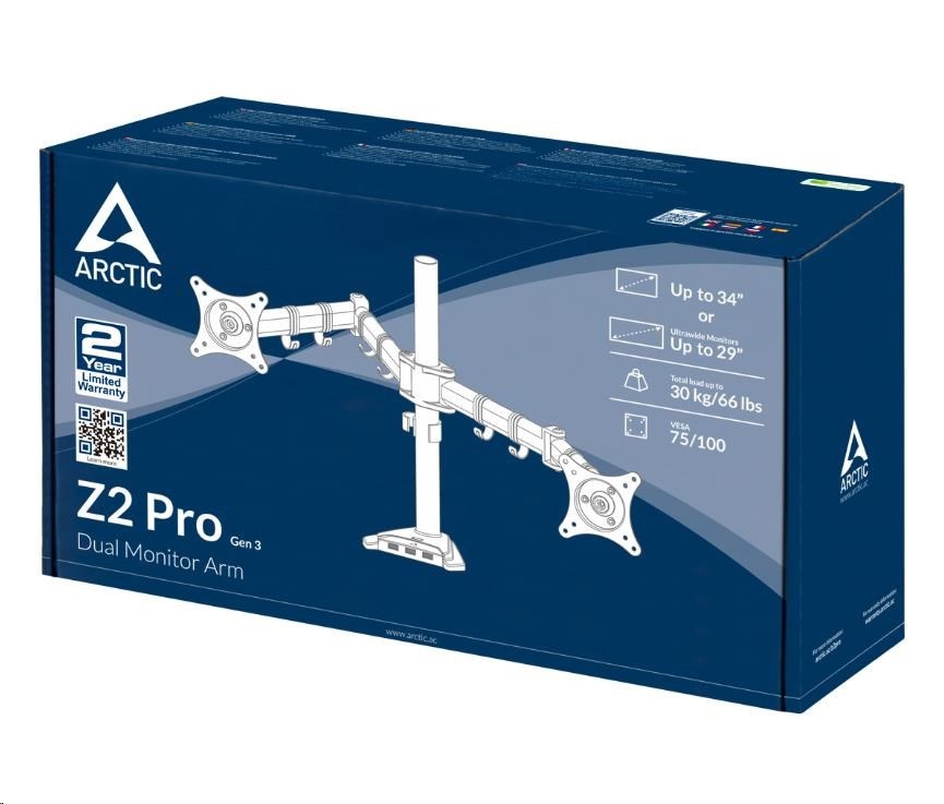 Rameno monitora ARCTIC Z2 Pro bez problémov podporuje najnovšie ultraširokouhlé monitory (do 29 palcov). Kompatibilné sú aj klasické monitory s pomerom strán 16:9 (do 34 palcov). Z2 Pro unesie celkovú záťaž 15 kg/33 libier.
