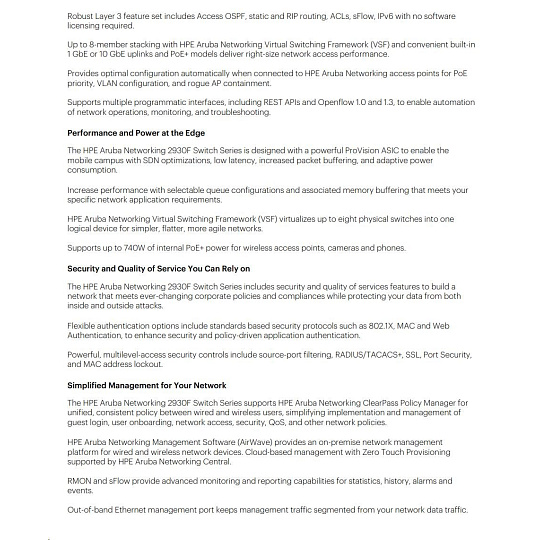 Řada přepínačů HPE Aruba Networking 2930F je navržena pro digitální pracoviště optimalizovaná pro mobilní uživatele. Tyto výkonné přístupové přepínače vrstvy 3 se snadno nasazují a spravují pomocí pokročilých bezpečnostních a nástrojů pro správu sítě, jako jsou HPE Aruba Networking ClearPass Policy Manager, HPE Aruba Networking Management Software (AirWave) a cloudové řešení HPE Aruba Networking Central. HPE Aruba Networking Virtual Switching Framework (VSF) poskytuje škálovatelnost stohování a jednoduchost pro podnikové okraje sítě, SMB a pobočky. Model 2930F nabízí výkon a hodnotu díky podpoře směrování RIP, Access OSPF, 10GbE uplinkům, až 740 W PoE+, pokročilému QoS a nevyžaduje žádné softwarové licence.
