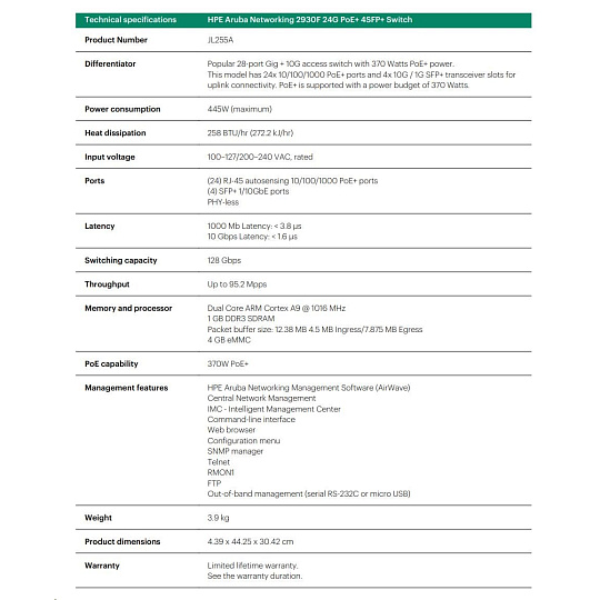 HPE Aruba Networking 2930F 24G PoE+ 4SFP+ Switch Specifications