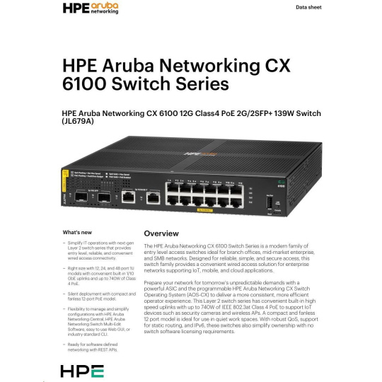 | Aruba 6100 12G Class4 PoE 2G/2SFP+ 139W Switch (JL679A) | |