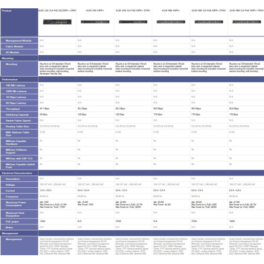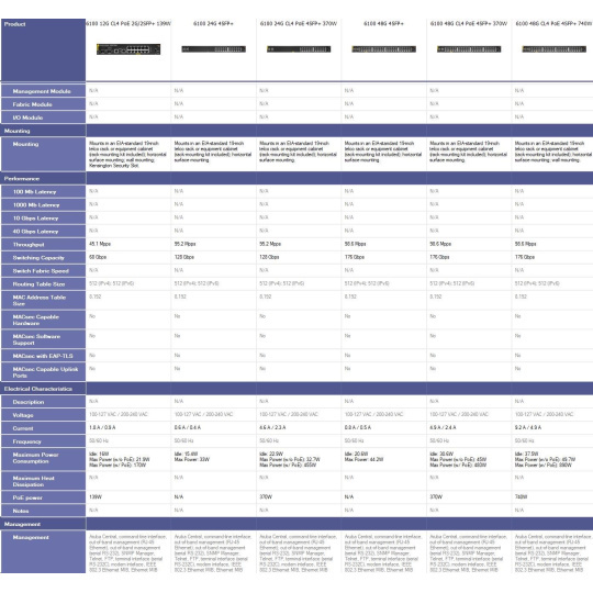 | Power Consumption (230 VAC) | Idle: 30.6W Max Power (w/o PoE): 45W Max Power (w/ PoE): 480W |
