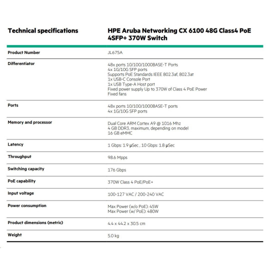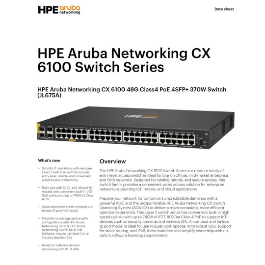 | Aruba 6100 48G Class4 PoE 4SFP+ 370W Switch (JL675A)) | |