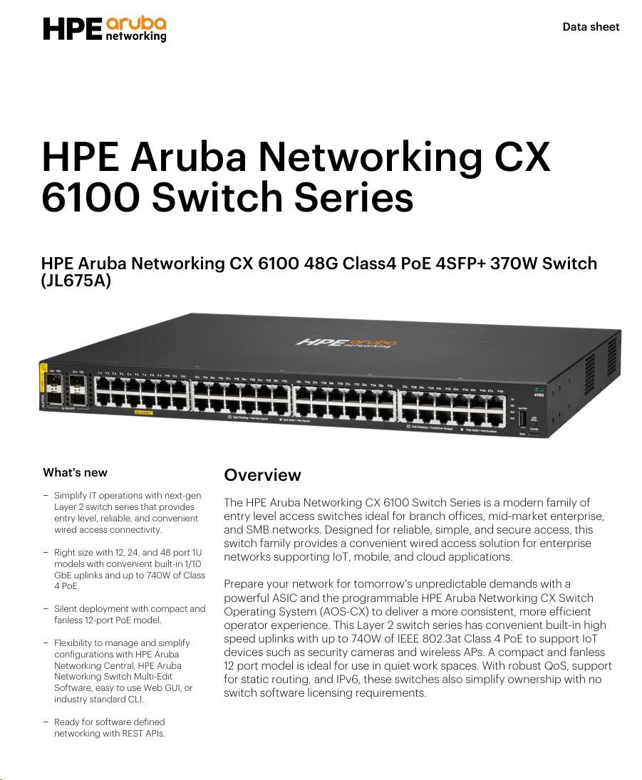 | Aruba 6100 48G Class4 PoE 4SFP+ 370W Switch (JL675A)) | |