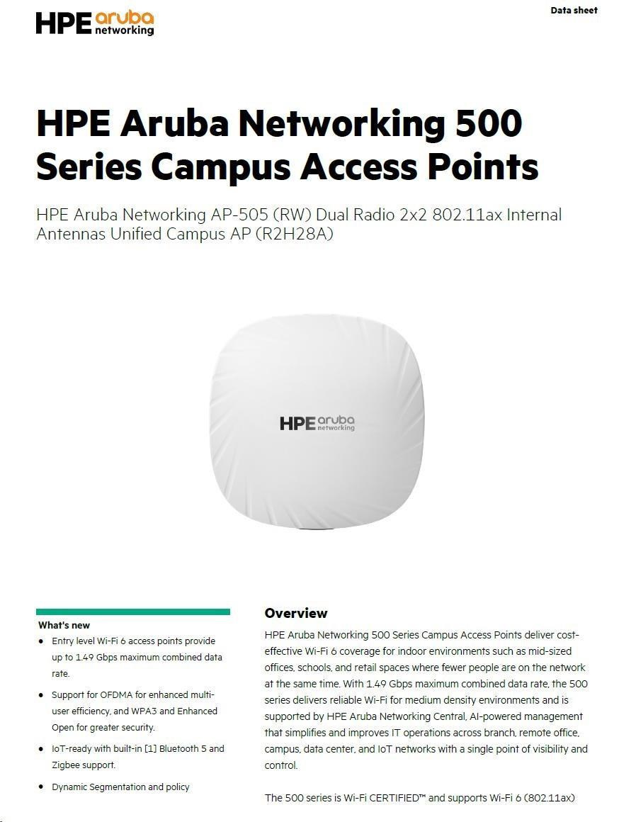 HPE Aruba Networking AP-505 (RW) Dual Radio 2x2 802.11ax Internal Antennas Unified Campus AP