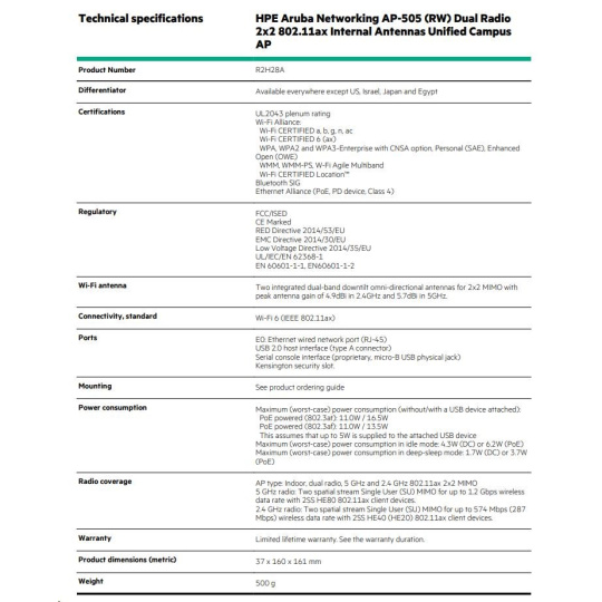 Technical specifications HPE Aruba Networking AP-505 (RW) Dual Radio 2x2 802.11ax Internal Antennas Unified Campus AP Product Number R2H28A Differentiator Available everywhere except US, Israel, Japan and Egypt Certifications UL2043 plenum rating Wi-Fi Alliance: Wi-Fi CERTIFIED a, b, g, n, ac Wi-Fi CERTIFIED 6 (ax) WPA, WPA2 and WPA3-Enterprise with CNSA option, Personal (SAE), Enhanced Open (OWE) WMM, WMM-PS, W-Fi Agile Multiband Wi-Fi CERTIFIED Location™ Bluetooth SIG Ethernet Alliance (PoE, PD device, Class 4) Regulatory FCC/ISED CE Marked RED Directive 2014/53/EU EMC Directive 2014/30/EU Low Voltage Directive 2014/35/EU UL/IEC/EN 62368-1 EN 60601-1-1, EN60601-1-2 Wi-Fi antenna Two integrated dual-band downtilt omni-directional antennas for 2x2 MIMO with peak antenna gain of 4.9dBi in 2.4GHz and 5.7dBi in 5GHz. Connectivity, standard Wi-Fi 6 (IEEE 802.11ax) Ports E0: Ethernet wired network port (RJ-45) USB 2.0 host interface (type A connector) Serial console interface (proprietary, micro-B USB physical jack) Kensington security slot. Mounting See product ordering guide Power consumption Maximum (worst-case) power consumption (without/with a USB device attached): PoE powered (802.3at): 11.0W / 16.5W PoE powered (802.3af): 11.0W / 13.5W This assumes that up to 5W is supplied to the attached USB device Maximum (worst-case) power consumption in idle mode: 4.3W (DC) or 6.2W (PoE) Maximum (worst-case) power consumption in deep-sleep mode: 1.7W (DC) or 3.7W (PoE) Radio coverage AP type: Indoor, dual radio, 5 GHz and 2.4 GHz 802.11ax 2x2 MIMO 5 GHz radio: Two spatial stream Single User (SU) MIMO for up to 1.2 Gbps wireless data rate with 2SS HE80 802.11ax client devices. 2.4 GHz radio: Two spatial stream Single User (SU) MIMO for up to 574 Mbps (287 Mbps) wireless data rate with 2SS HE40 (HE20) 802.11ax client devices. Warranty Limited lifetime warranty. See the warranty duration. Product dimensions (metric) 37 x 160 x 161 mm Weight 500 g