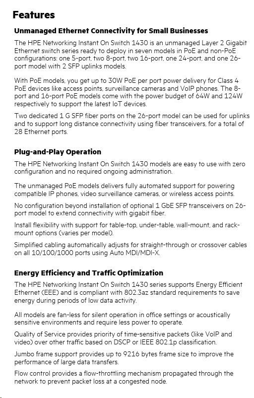 | I/O ports and slots | 16 RJ-45 autosensing 10/100/1000 Class 4 PoE ports (IEEE 802.3 Type 10BASE-T, IEEE 802.3u Type 100BASE-TX, IEEE 802.3ab Type 1000BASE-T); Duplex: 10BASE-T/100BASE-TX: half or full; 1000BASE-T: full only | |