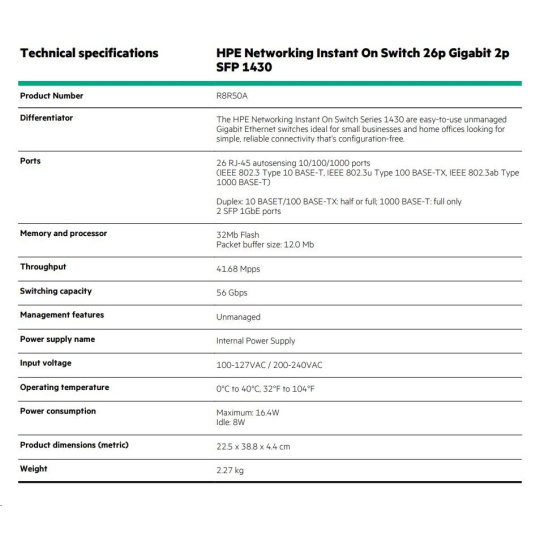 | Model | HPE Networking Instant On 1430 — 26p Gigabit + 2 SFP |