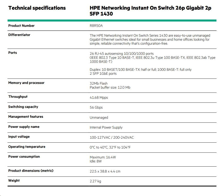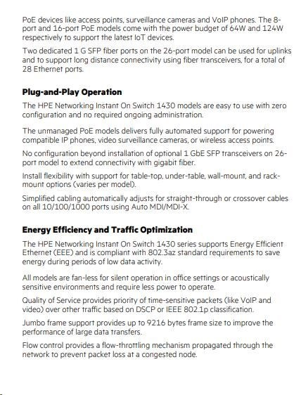 | Model | HPE Networking Instant On 1430 — 26p Gigabit + 2 SFP |