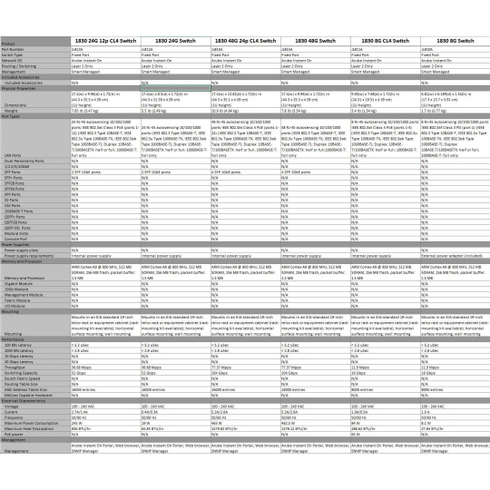 | Aruba Instant On 1830 8G Switch (JL810A) | Aruba Instant On 1830 8G 4p Class4 PoE 65W Switch (JL811A) | Aruba Instant On 1830 24G 2SFP Switch (JL812A) | Aruba Instant On 1830 24G 12p Class4 PoE 2SFP 195W Switch (JL813A) | Aruba Instant On 1830 48G 4SFP Switch (JL814A) | Aruba Instant On 1830 48G 24p Class4 PoE 4SFP 370W Switch (JL815A) | ||||