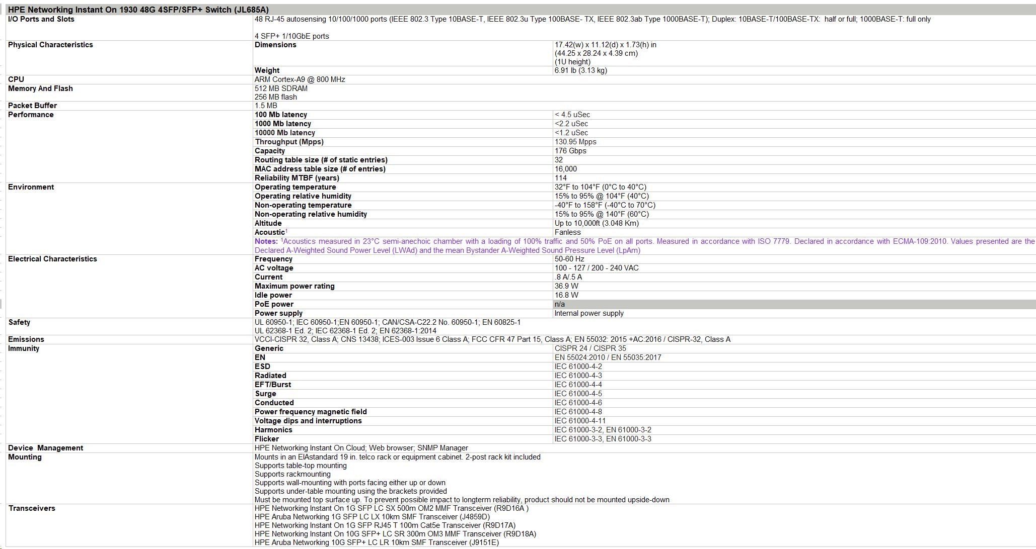 Notes: 1Acoustics measured in 23°C semi-anechoic chamber with a loading of 100% traffic and 50% PoE on all ports. Measured in accordance with ISO 7779. Declared in accordance with ECMA-109:2010. Values presented are the Declared A-Weighted Sound Power Level (LWAd) and the mean Bystander A-Weighted Sound Pressure Level (LpAm) | ||