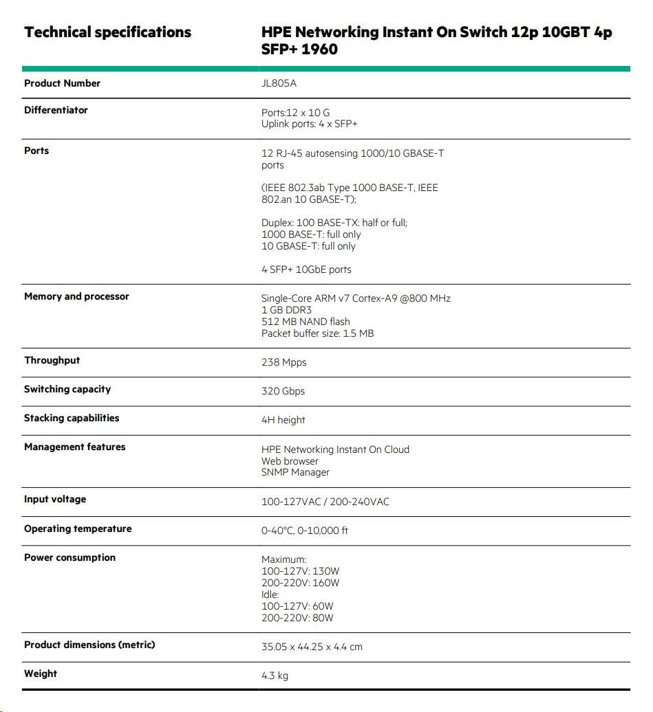 HPE Networking Instant On Switch 12p 10GBT 4p SFP+ 1960 (JL805A)