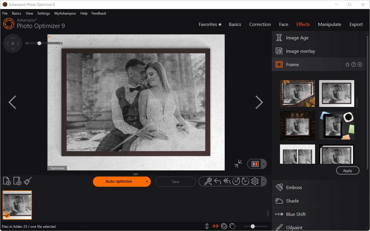 Ashampoo Photo Optimizer samozrejme obsahuje všetky bežné funkcie, ako je orezávanie, otáčanie, vodoznaky a zmäkčenie obrázkov. Ale tým to nekončí. Nebojte sa tvorivého prístupu k umeleckým efektom a elegantným návrhom rámov. Či už obnovujete neuspokojivé zábery, zvyšujete kvalitu záberov o ďalších 5 % alebo sa len bavíte, tento program je pre vás ten pravý!
