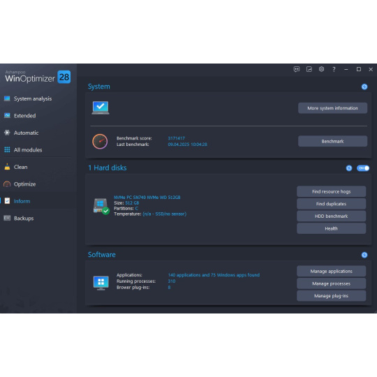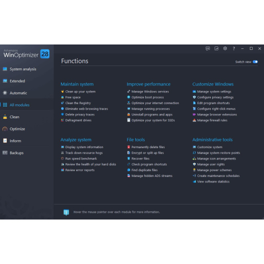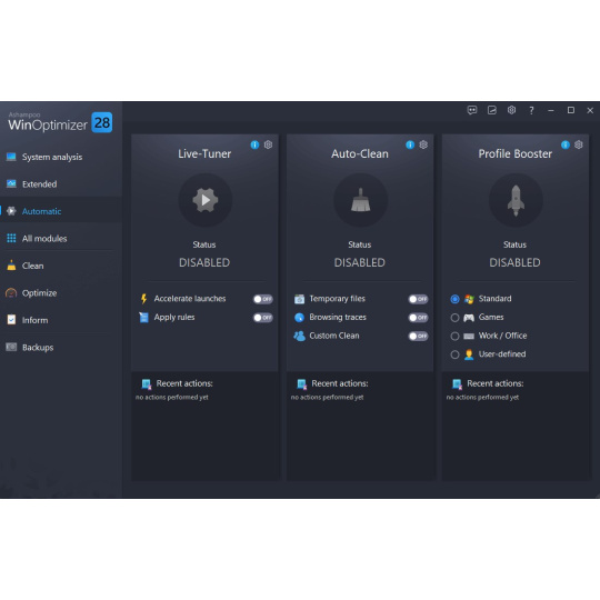 S novým programom Ashampoo WinOptimizer 28 získate automaticky najlepší zážitok z práce s Windowsom. Jeho nová automatizácia zrýchľuje, čistí a ladenie vaše aplikácie. Nechajte svoj počítač plynule prispôsobiť vašim potrebám pomocou priorít procesov, automatického čistenia dočasných súborov a vlastných konfigurácií profilov na základe nového nástroja Profile Booster. Či už ide o hranie hier, prácu alebo prehliadanie webu, maximalizujte výkon systému alebo šetrite prostriedky, voľba je na vás. Nový nástroj Crash Analyzer ponúka hlboký pohľad na pády systému a ich príčiny, zatiaľ čo štyri pokročilé čističe zabezpečujú súkromie a poskytujú údržbu systému. Vďaka vylepšenej správe pamäti dokáže WinOptimizer využiť viac prostriedkov na vykonávanie komplexných analýz takmer okamžite!