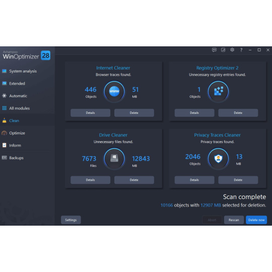Spoľahlivé čističe boli neustále vylepšované a teraz obsahujú úplne nové vyhľadávacie algoritmy pre ešte výkonnejšie čistiace schopnosti. Zameriavajú sa nielen na odstraňovanie neporiadku, stop po prehliadaní a nepotrebných položiek registra, ale kladú väčší dôraz na citlivé dáta. S nástrojom Privacy Traces Cleaner dosahujú bezprecedentnú ochranu súkromia. Dokonca aj vyhľadávanie a odstraňovanie prázdnych priečinkov je teraz bez problémov. Čističe sú samozrejme optimalizované pre všetky podporované operačné systémy, aktuálne aktualizácie a všetky bežné prehliadače.