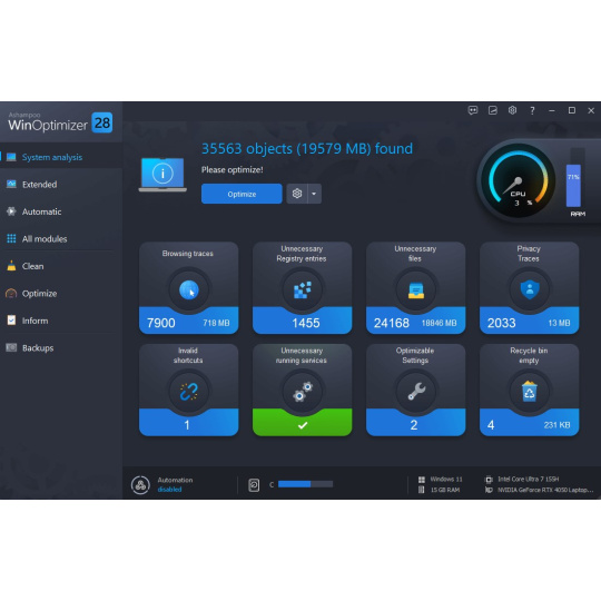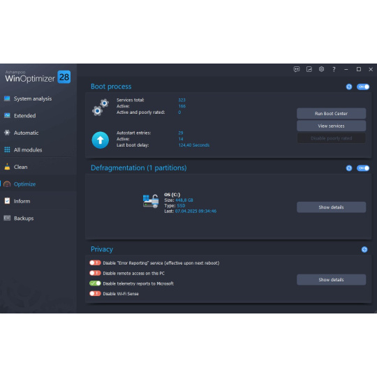 Automatická optimalizácia systému Windows je už dlho neoddeliteľnou súčasťou programu WinOptimizer. Je načase postarať sa o zvyšok! Tuning Assistant vám položí niekoľko jednoduchých otázok s ďalekosiahlymi dôsledkami. Každá odpoveď vás priblíži k rýchlejšiemu, diskrétnejšiemu a bezpečnejšiemu počítaču so systémom Windows - a to všetko pri neformálnej konverzácii s naším softvérom. Vypnite nepotrebné služby na pozadí, optimalizujte nastavenia zabezpečenia a prispôsobte systém Windows pre lepší výkon a súkromie, a to bez rizika!