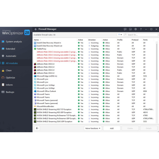 Máte prehľad o tom, ktoré aplikácie majú prístup k internetu? Zaujíma vás, čo prichádza a odchádza a ktoré pravidlá môžu byť zastarané? S novým Správcom brány Firewall môžete plne kontrolovať sieťový prevádzku. Jednoducho zistíte, čo je povolené a kde by bolo treba zasiahnuť. Vďaka základnému, štandardnému a pokročilému režimu, inteligentným filtrom a filtru pre vyhľadávanie deaktivovaných alebo chybových pravidiel rýchlo zistíte, ktoré aplikácie môžu odosielať alebo prijímať dáta, a môžete rozhodnúť, čo má byť povolené alebo blokované. Prevezmite späť kontrolu nad prevádzkou svojho počítača len niekoľkými kliknutiami.