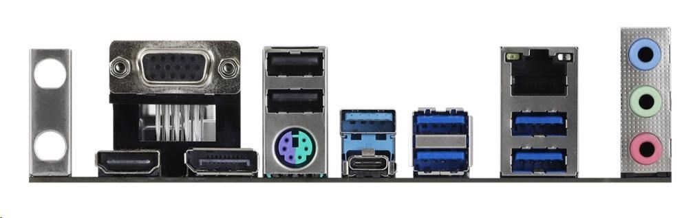 | Vstupy/výstupy na zadnom paneli | - Držiak antény - 1 x port PS/2 pre myš/klávesnicu - 1 x port D-Sub - 1 x port HDMI - 1 x DisplayPort 1.4 - 1 x USB 3.2 Gen1 port typu A (podporuje ochranu proti ESD) - 4 x USB 3.2 porty typu A Gen1 (rozbočovač ASMedia ASM1074) (podporuje ochranu proti prepätiu) - 1 x USB 3.2 Porty typu C Gen1 (podporuje ochranu proti prepätiu) - 2 x USB 2.0 portov (podporuje ochranu proti ESD) - 1 x RJ-45 LAN port s LED diódou (ACT/LINK LED a SPEED LED) - HD audio konektory: Line in / Front Speaker / Microphone |