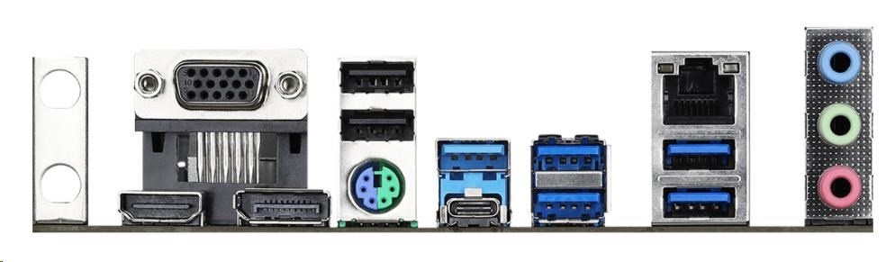 | Vstupy/výstupy na zadnom paneli | - Držiak antény - 1 x port PS/2 pre myš/klávesnicu - 1 x port D-Sub - 1 x port HDMI - 1 x DisplayPort 1.4 - 1 x USB 3.2 port typu A Gen2 (10 Gb/s) (podporuje ochranu proti prepätiu) - 1 x USB 3.2 Gen2 port typu C (10 Gb/s) (podporuje ochranu proti ESD) - 4 x USB 3.2 porty Gen1 (rozbočovač ASMedia ASM1074) (podporuje ochranu proti prepätiu) - 2 x USB 2.0 portov (podporuje ochranu proti ESD) - 1 x RJ-45 LAN port s LED diódou (ACT/LINK LED a SPEED LED) - HD audio konektory: Line in / Front Speaker / Microphone |