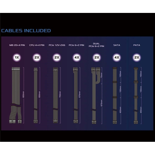 | Dvojitý PCIe 6+2 Pin Konektor | 2x / 2x (675 + 75 mm) |