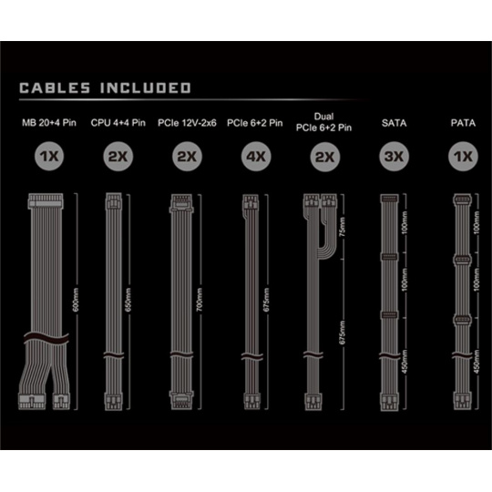 | Dvojitý PCIe 6+2 Pin Konektor | 2x / 2x (675 + 75 mm) |