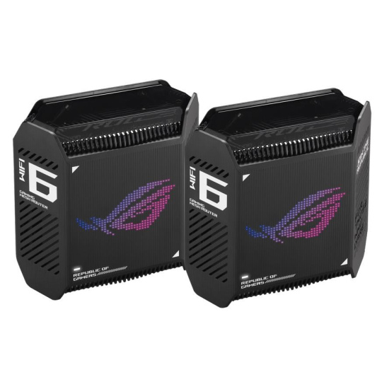 ROG Rapture Wifi 6 802.11ax Tri-band Gigabit Gaming Mesh System Wifi 6 802.11ax 574Mbps (2.4G) Wifi 6 802.11ax 4804Mbps (5GHz-1) Wifi 6 802.11ax 4804Mbps (5GHz-2) Data rate: 10000Mbps Whole home mesh wifi system for large and multi-story homes Supports flexible SSID setting, wired inter-router connections OFDMA + MU-MIMO tech, 1024 QAM, 2.5G WAN port, Triple level Game Acceleration, Aura RGB lighting, AiProtection Pro, VPN Fusion, Instand Guard Adaptive QoS, Bandwidth control, AiMesh, ASUS Roter APP (ROG theme).